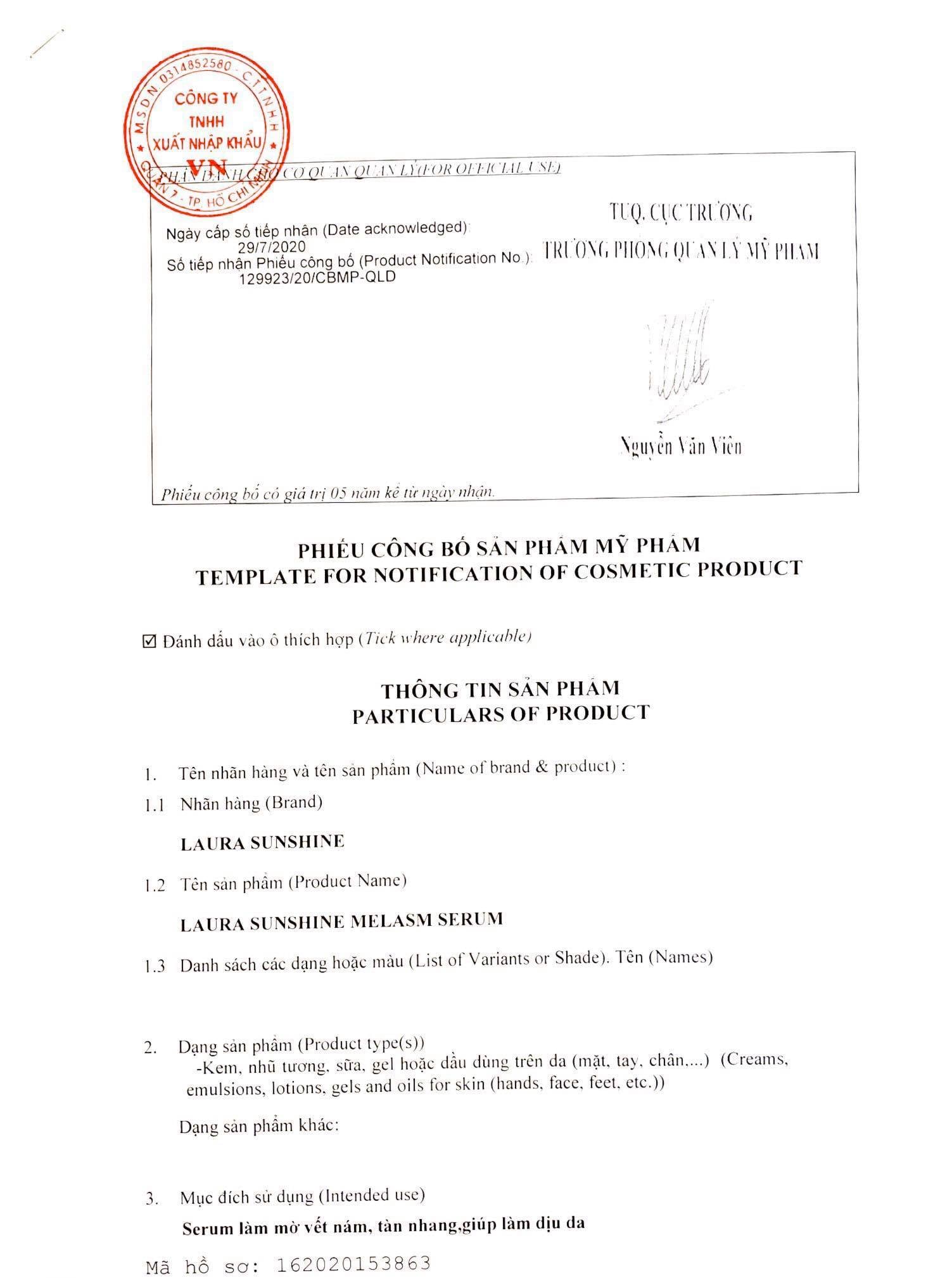 Công bố hợp qui Laura Sunshine Melasm Serum