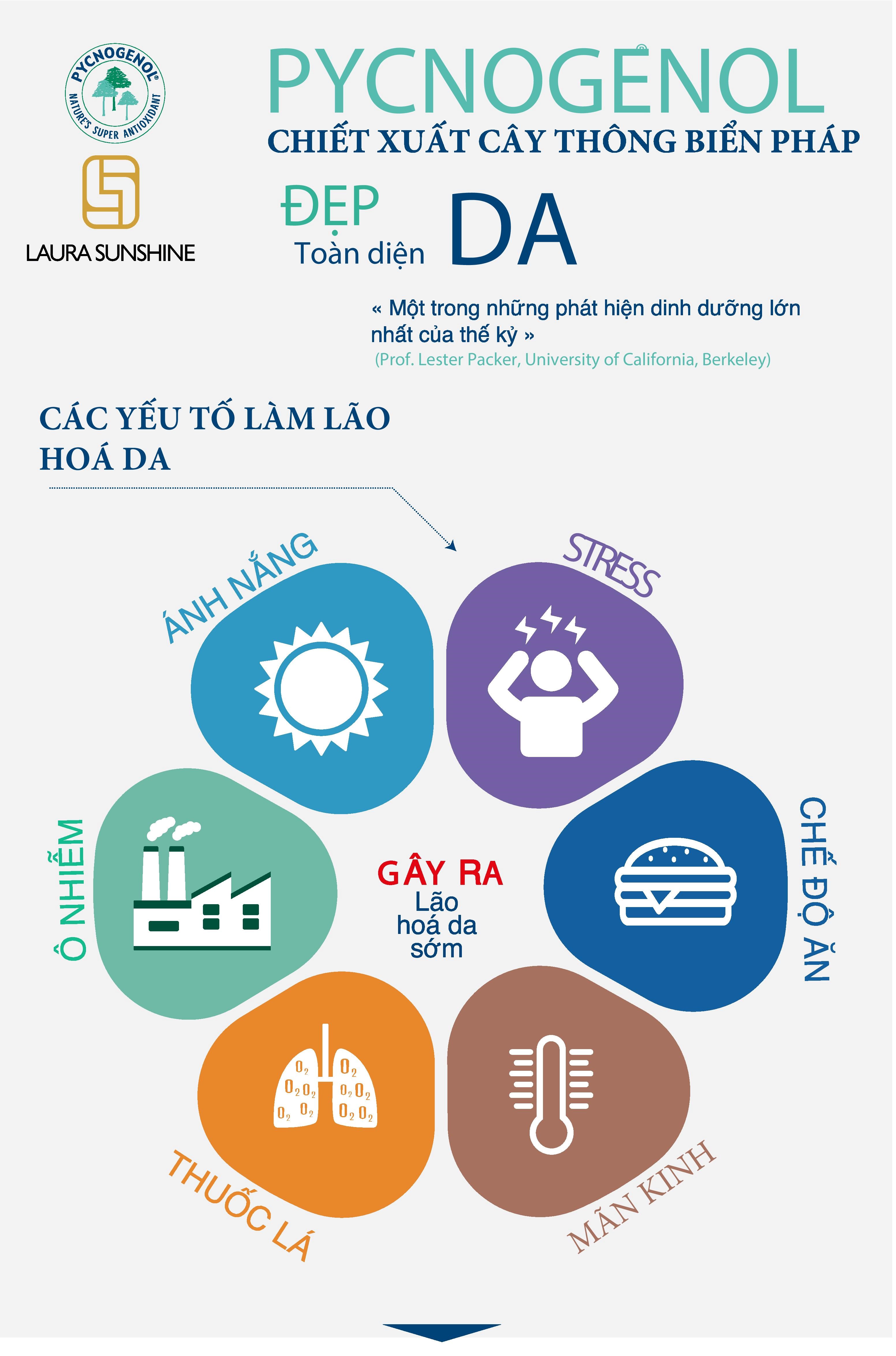 Pycnogenol được chiết xuất từ cây thông đỏ của Pháp. Chất chống oxy hóa này mạnh hơn 50 lần so với vitamin E, cũng là chất chống viêm tự nhiên với đặc tính bảo vệ. Có rất nhiều tác dụng :