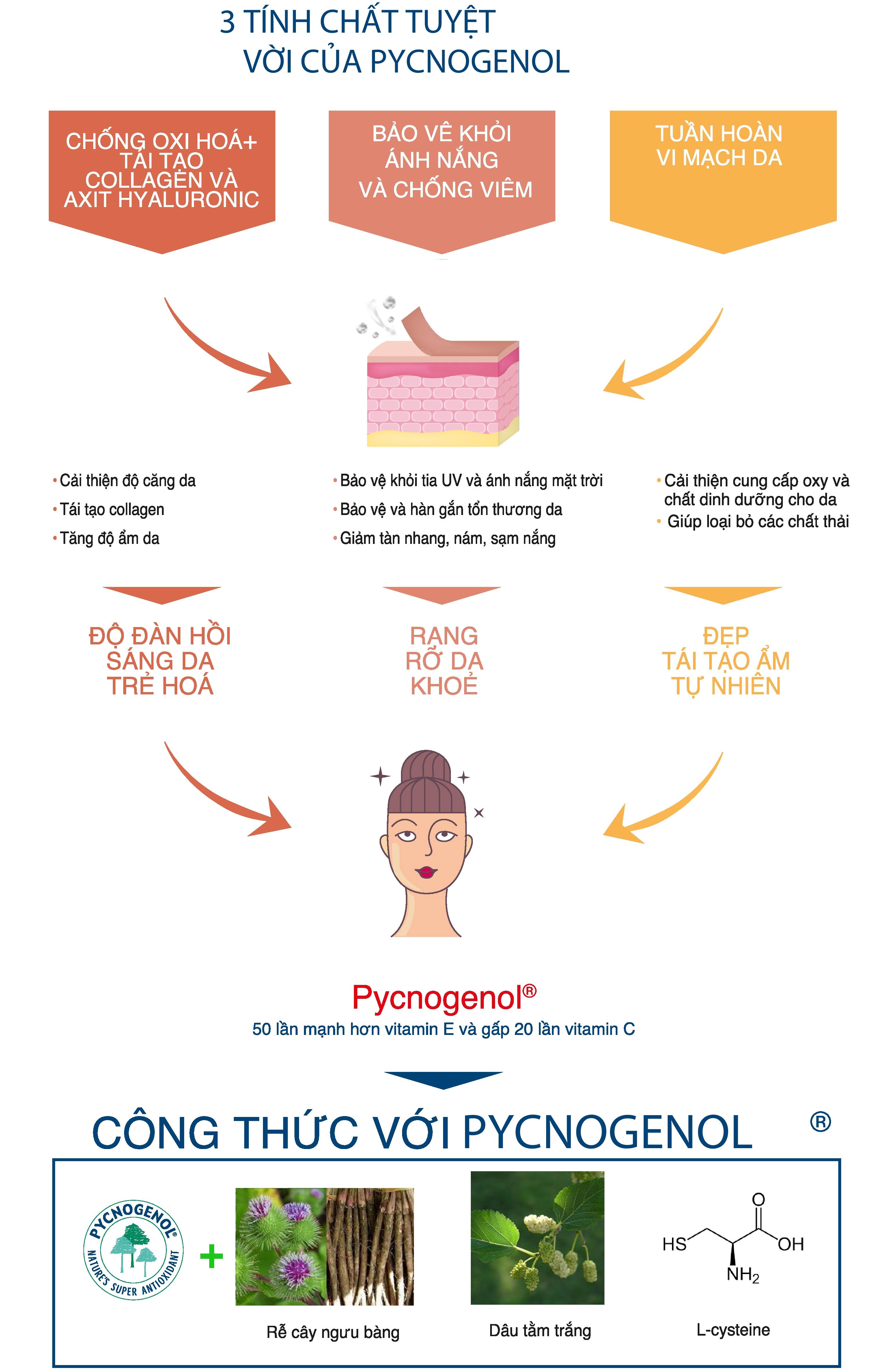 Với công thức đột phá Kết hợp Pycnogenol chiết xuất từ cây thông đỏ Pháp cùng 2 tinh chất từ thiên nhiên khác